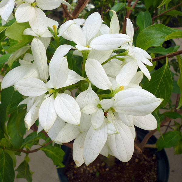 崑崙花 沖縄本島の山原に自生するテマリコンロンカ ハンカチの花 手毬崑崙花花木 庭木の苗/コンロンカ:山原星(ヤンバルブシ)4.5号ポット白いホウが爽やかで、夏の鉢花として人気のコンロンカ。南西諸島から台湾原産の常緑低木です。白く美しい花弁のように見える部分はガク片で、花は小さく星形の黄色い部分です。山原星(ヤンバルブシ)は沖縄県の山原に自生する品種。一般的なコンロンカ(Mussaenda parviflora)と異なり、白いホウが手毬状に集まって咲く愛らしい品種で、テマリコンロンカと呼ばれます。開花は主に6月〜9月ですが、温室など気温が高く日照が十分ある環境では四季咲きとなります。学名:Mussaenda parvifloraタイプ:アカネ科コンロンカ属の常緑半つる性低木別名:ムッサエンダ、ハンカチの花開花期:6〜9月草丈:0.5〜2m(成長時)耐寒性:5度まで日照:日向むき栽培方法:夏は戸外の半日蔭、それ以外の季節は日当たりのよい場所で管理します。生育中は1〜2ヶ月に1回、緩効性肥料を根元に置肥してください。肥料切れすると葉が黄変するのでご注意ください。新しく出た枝に花がつくので、咲き終わった枝は刈り込んで脇芽を出させるようにします。放任すると枝がつる状に伸びるので、適宜選定して形を整えます。夏の間は毎日水遣りし、冬は乾燥気味に管理します。冬季は10度以上あれば越冬できますが、戸外での冬越しは難しいので、室内の明るく温かい場所で管理してください。4.5号(直径13.5cm)鉢植えです。※写真はイメージです。