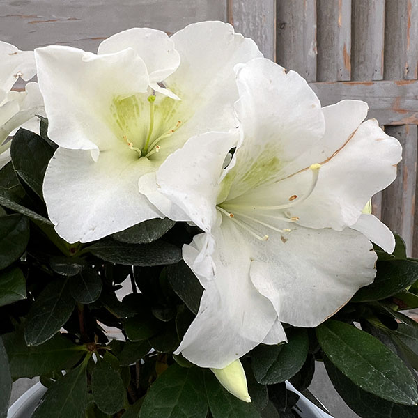 2月下旬以降開花予定株 こしのあわゆき 新潟産 半八重中大輪種 淡緑色を帯びた清楚な白花種花木 庭木の苗/アザレア:越の淡雪4.5号鉢植え越の淡雪は大輪半八重の白花品種。花弁の上部に黄緑色の斑点が入るのが特徴です。やわらかな花色とボリュームのある花が魅力的です。アザレアは日本〜東南アジア原産のツツジがヨーロッパに渡り、品種改良された西洋ツツジの流通名。鮮やかな色の八重の花を株いっぱいに咲かせ、日本のツツジよりも華やかな印象で、鉢花として親しまれています。タイプツツジ科の半耐寒性常緑低木開花期10〜4月(促成栽培品が蕾〜開花状態で出荷され、特に10月から春にかけての鉢花として多く出回ります。但し、家庭で育てた場合は春に開花)樹高15〜30cm日照日向むき栽培方法:春から10月頃まではできるだけ戸外の日当たりのよい場所で管理し、寒くなってきたら室内に取り込み、5度以上を保ちながら明るい窓辺で管理します。真夏は葉やけを避けるため、日よけなどで遮光してください。鉢土の表面が乾いたらたっぷりと水を与えます。その際、花に水をかけないよう注意してください。花柄は早めに摘み取ります。花後の5月頃に一回り大きな鉢に植え替えます。植え土はやや酸性を好むため、鹿沼土やピートモスを混ぜて植えつけてください。春から秋まで油かすなどの肥料を定期的に与えます。開花中は肥料を与えないでください。4.5号(直径13.5cm)鉢植えです。※品種登録または品種登録出願済みの品種ですので、無許諾で苗木等を増殖して販売することはできません。※写真はイメージです。