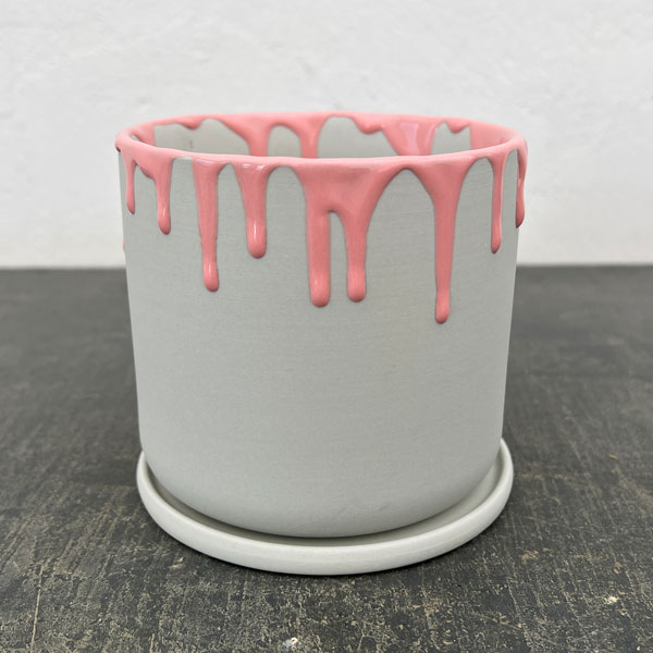 陶器鉢 3号用鉢カバードリーナ11G(直径11cm)グレー&ピンク・皿付/84092まるでアイシングを施したスイーツのような、遊び心あふれる植木鉢。マットな質感の鉢に、とろりと垂れるパステルカラーの釉薬が目を引きます。多肉植物や小さな観葉植物と合わせて飾れば、空間がぱっと明るくなります。サイズ(約)直径11cm、高さ10cm、口内寸9.5cm底穴あり(受け皿付き)材質セラミック※釉薬の垂れ具合には個体差があります。※写真はイメージです。植物はついていません。
