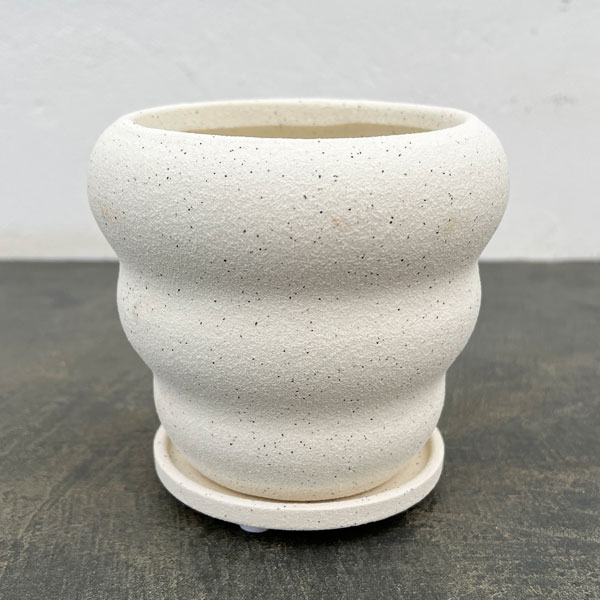陶器鉢 3号用鉢カバーマノン:白M(直径12.5cm)・受け皿付モコモコとした段々の造形がかわいらしい陶器鉢。ぽってりとした丸みのあるデザインに、素朴なパステルカラーが、空間にやわらかな彩りを添えてくれます。濃い緑の観葉植物から淡いカラーの多肉植物まで、どんな植物とも相性よく馴染みます。どんな植物に合わせるか、想像もふくらむ一鉢です。揃いの受け皿付き。サイズ(約)直径12.5cm、高さ10.5cm(内径9cm)素材陶器底穴あり(受け皿付き)※写真はイメージです。植物はついていません。