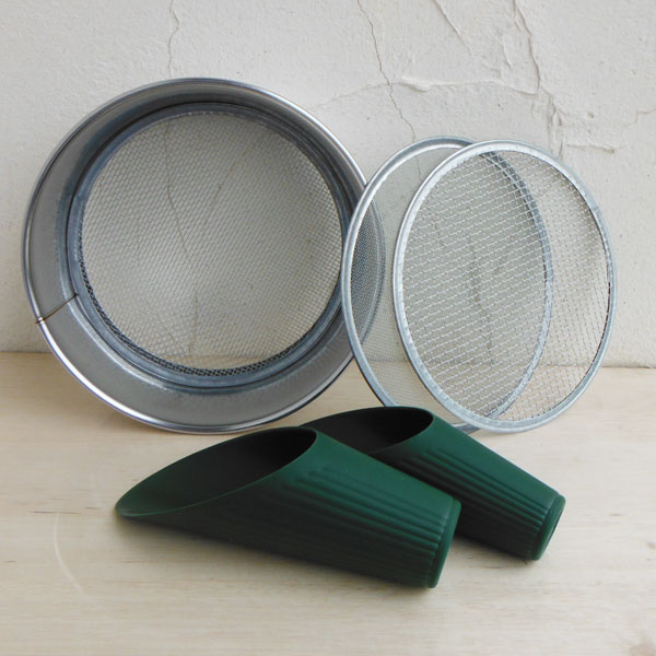 ふるい:ステンレス フルイ (直径21cm・アミ3枚付)と土すくいセットふるいと土すくいのセットです。セット内容:ふるい:ステンレス フルイ (直径21cm・アミ3枚付)[土ふるい] × 1セット土すくい[土入れ]:グリーン2個セット × 1セット<ふるい:ステンレス フルイ (直径21cm・アミ3枚付)、ステンレス製の土ふるい。丈夫でさびに強いので、長期間快適にお使いいただけます。替え網式で、目の大きさの異なる網が3枚ついています。目の内側のサイズはそれぞれ約1mm、3mm、6mmです。網は亜鉛メッキの線材です。みじん土や鉢底石の除去など、古土の再生作業で活躍します。直径21cmと小型サイズです。サイズ:本体直径21cm(網の直径18.4cm)、高さ6.5cm替え網/網目のサイズ約1mm、3mm、6mm 網目サイズは製品特性上、多少誤差があります。重量:245g<土すくい[土入れ]:グリーン2個セット>寄せ植えなどに便利な土入れ、大小2個セットです。土がこぼれず、狭いスペースへの土入れに欠かせません。プラスチック製なので軽量です。価格もお手ごろです。サイズ:大は長さ17cm、幅7cm、小は長さ17cm、幅6.2cm色:グリーンふるい:ステンレス フルイ (直径21cm・アミ3枚付)と土すくいセットの栽培ガイド花壇の土とプランター用土