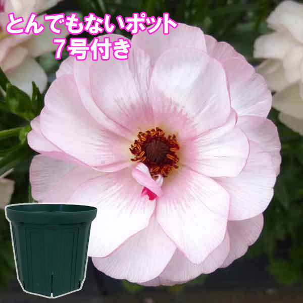 光沢のあるスプレー咲きの人気品種草花の苗/ラナンキュラス:ラックス ヴィーナス3.5-4号ポット/とんでもないポット付き★入荷から日数が経ったためセール価格となりました。商品の状態は画像と異なる場合があります。★ラックスシリーズはラナンキュラスの育種・品種改良を手がけて20年の綾園芸さん作出のオリジナル品種。光沢のある花びらが特徴で、日光が当たるとより輝き非常に美しいです。スプレー咲きで春まで次々に開花します。開花しながら成長を続けるので徐々に花数が増え、春遅くまで何十輪もの花が楽しめます。お届けした鉢の状態でも花を楽しめますが、より大きな鉢や花壇に植え替えればさらに株が充実し花数も増え、草丈は最大1m位になります。2012年に開催されたフロリアード(10年に1度開催される世界最大の国際園芸博覧会)にて9点以上のゴールドメダルを獲得した品種を含むシリーズです。寒さにも強く、凍らせなければ軒下で管理して冬越しさせることもでき、また春に花を楽しめます。写真はイメージです。セット内容:・ラナンキュラス:ラックス ヴィーナス3.5-4号ポット × 1・とんでもないポット:7号CSM-210(モスグリーン) × 1ラナンキュラスラックス ヴィーナス3.5-4号ポットタイプキンポウゲ科の耐寒性球根植物草丈〜100cm開花期〜4月頃用途鉢植え、花壇、切花日照日向とんでもないポット7号CSM-210(モスグリーン)色モスグリーン形状8角形サイズ外径21cm、底径17.5cm、高さ18.6cm色モスグリーン土容量約4.3リットル栽培方法:日当たり、水捌けの良い場所が適します。肥料は植付け時と、花付きが悪くなったら与えましょう。ラックスの育て方(PDFファイルが開きます)○とんでもないポット:7号CSM-210(モスグリーン)プロの果樹・樹木の栽培農家で愛用されている、多年栽培用ポットです。シンプルでありながら特殊な構造によりこれまでにないほど長い年数の栽培に耐えることが実証されています。ご家庭での花木や果樹の栽培にもおすすめです。価格もお手ごろです。鉢底裏の特殊構造により、根の旋回現象(サークリング)を防止し、鉢内のみで健全な根形を形成します。また、用土内の水分を均一化し中心部に多くの根を育成し、コーナーと側面の段差により、根を下方へ誘導します。弾力性のある軟質ポリ素材なので、樹皮の損傷を防止します。ラナンキュラス:ラックス ヴィーナス3.5-4号ポット/とんでもないポット付きの栽培ガイドラナンキュラス:ラックスシリーズ