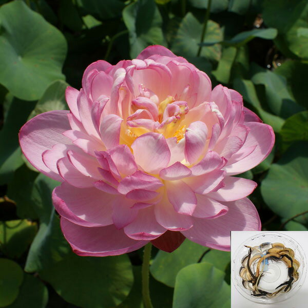 茶碗蓮・チャワンバス 小型容器でも5輪以上開花するおすすめ品種草花の苗/花はす:レンコン丸:暁天(ギョウテン)★入荷から日数が経ったためセール価格となりました。商品の状態は画像と異なる場合があります。★とてもユニークな、カップ入りの花はすの苗(レンコン)です。大木園芸さんの「手乗りハス」シリーズの苗です。手にのるほどの小さめの容器で栽培できるよう改良した、観賞用の花はすです。ご家庭で水鉢やバケツ・タライなどの底穴の無い容器に土を入れて苗を植え付け、水を張れば栽培できますので、手軽に美しいハスの花を咲かせてお楽しみください。品種:暁天(ギョウテン) ピンク系の品種。小型容器でも花が上がりやすく丈夫で栽培しやすい品種です。直径20cmの容器でもよく花を咲かせます。花の色が画像と多少異なる場合があります。開花数:直径13.5cm以上の容器で花5輪、大型容器ならさらに花数が増えます(生産者の平均開花数です。栽培環境により異なるため、この数の花つきを保証するものではありません)「手乗りハス」とはハス科ハス属の植物で、食用のレンコンの仲間です。「手乗りハス」は、池や沼、大型のタライでなくては栽培できないと思われていた花ハスを、直径30〜60cmほどの容器で栽培できるように改良・育種した品種です。食用のレンコンや普通の花ハスは小型容器では栽培できません。「手乗りハス」は容器の大きさに合せて葉・花・レンコンが育ちます。大型の容器で栽培すると大きい葉と花を咲かせ花数も増えます。小型の容器で栽培すると可愛い葉となり、花数は減りますが、美しい花が観賞できます。苗(レンコン)は最初の2枚ほどの葉を出す養分を持っていますが、その後は葉が光合成して成長するため、苗の大小にかかわらず、花を咲かせます。タイプ:ハス科の多年草(浮葉植物)植え付け適期:2月下旬〜4月上旬頃まで開花期:6〜8月日照:日なた(冬季休眠中は弱光でもOK)耐寒性:強(目安マイナス5度 地下茎が凍らなければOK)耐暑性:気温・水温とも40度まで順調に生育栽培方法:直径20cm以上、深さ20cm以上の水鉢や底穴のない容器を用意します。赤玉土(小粒)や水生植物用の土、田土、畑土、荒木田土を深さ10cmほど入れ、苗を直接植えます。植え付けの際に芽を折らないよう注意します。水を用土の上10cmになるよう入れて芽が出るのを待ちます。日当たりを好むので、よく日が当たる場所に置きます。植え付け後2週間ほど過ぎてから、初夏までの生育期に2週間に1回程度、発酵済の固形油粕(小指の先大)を7号(直径約21cm)容器では2〜3個程度与えますが、養分が容器に全てとどまるので、やりすぎないよう注意してください。植え付け後しばらくは水位を5センチぐらいと浅めにすると水温が高くなりよく生育しますが、逆に、20〜30センチと深すぎると生育が悪くなります。葉が2枚展開するまでは水深10cmとし、水を切らさないように注意して下さい。葉が生育すれば容器の縁まで雨水がたまっても大丈夫です。水が1cm以下にならないよう注意します。夏から秋にかけて地下茎が肥大化しレンコン(蓮根)ができます。冬場は一度枯れたようになりますが、株が残り越冬します。レンコンが凍らない環境なら戸外で越冬できます。寒冷地は屋内にとりこんでください。株分は 毎年、春(3月頃)に行います。株分けを兼ねて、用土を新しい土に入れ替えてください。写真は成長時(開花時)のイメージですが、お届けの際は苗(レンコン)の状態です。 花はす:レンコン丸:暁天(ギョウテン)の栽培ガイド水生植物大木園芸さんの手乗りハス