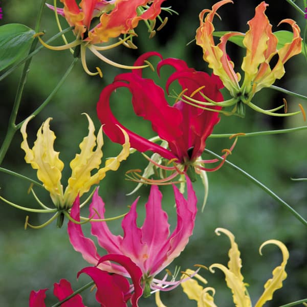 小型 独特の花が人気 鉢植え・花壇に!半つる性の球根植物球根/グロリオサ:ミックス4球入り蝶にも鳥にも見える独特の花姿が咲き誇る様子は見事。ツル性ですので、朝顔のように鉢・花壇で簡単に楽しめます。こちらは4球セットのミックス球根です。花色はランダムとなりますので予めご承知おきください。一般的な春植え球根の中でもやや芽出しが遅い植物です。別名キツネユリタイプイヌサフラン科キツネユリ属の非耐寒性球根植付時期5-6月開花時期7-9月草丈100-150cm植えつけ方法:日当たりのよい肥沃な土に植えつけます。植え付け時に腐葉土等の有機物を入れてください。また、緩効性化成肥料を元肥として施します。生育中及び夏は2週間に1度液肥を施し、また乾燥する場合はたっぷり潅水します。暖かい地方では生育旺盛となりますので、球根の間隔は広めにあけてください。鉢植えの場合には、6-7号に1球が目安です。つる性ですので、支柱やトレリスを立てて、つるをゆるめに誘引してビニールタイなどで固定します。寒さに弱いので、寒冷地では室内か温室栽培にしてください。花後はそのまま管理し、秋に球根を掘り上げて乾いたバーミキュライトに埋め、風通しのよい涼しい場所で保管し、翌春にまた植えつけます。春に株分けで増やすこともできます。※写真はイメージです。グロリオサ:ミックス4球入りの栽培ガイド秋植え球根のダブルデッカー植え球根の植付け秋植え球根