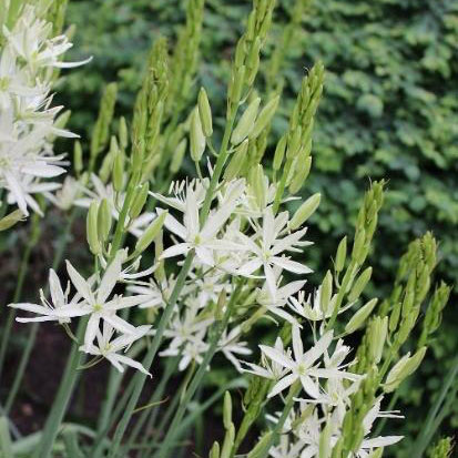 カマッシア 4〜5月開花 ホワイトの花が美しい強健な球根植物カマシア:ライヒトリニー アルバ4.5号ポットカマシアは北アメリカ原産の球根植物。日本ではオオヒナユリとも呼ばれています。春になると花茎を長く立ち上げ、星型の花を多数咲かせます。1本の花茎に30〜50程度の花をつけ、下から順に咲き進みます。極端な排水不良のところ以外なら、用土も選ばず、半日陰でも開花する丈夫な植物です。庭植えの場合は、植え付け後数年は放任栽培できるほど強健です。学名:Camassia leichtliniiタイプ:ユリ科(またはクサスギカズラ科)の耐寒性球根植物開花時期:4〜5月草丈:60〜100cm日照:日向〜半日陰耐寒性:強耐暑性:強栽培方法:日当たりの良い場所を好みますが、半日陰でも栽培できます。水はけの良い場所に植えてください。地植えの場合は植え付け後の水やりは不要です。鉢植えの場合は、鉢土の表面が乾いたらたっぷりと水やりし、水を切らさないようにします。開花終了後、葉が枯れるまで水やりを続け、夏は断水します。秋にまた芽が伸び始める頃に追肥をすれば、数年間は植え放しにできます。病虫害は特にありません。4.5号(直径13.5cm)ポット植えの苗です。カマシア:ライヒトリニー アルバ4.5号ポットの栽培ガイド秋植え球根のダブルデッカー植え球根の植付け秋植え球根