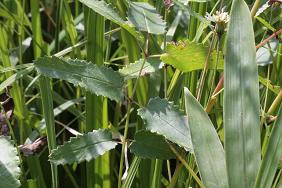 コメント:8月上旬から咲き始めている。花弁はなく赤紫のは萼です。