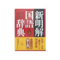 新明解 国語辞典 第七版 <br>ISBN10:4-385-13107-4 ISBN13:978-4-385-13107-8 著作:山田忠雄、柴田武、酒井憲二、倉持保男、山田明雄、上野善道、井島正博、笹原宏之 編 出版社:三省堂 発行日:2011年12月1日 仕様:二色刷/A5変型判/1726頁 対象:高校向 77,500項目を収録した国語辞典。 「文法」欄を新設。 より深い日本語理解のために、日常見落としがちな表現に目を向け、日本語を外からとらえる観点に立って文法事項について詳しく解説。 判型を大きくし、紙面を刷新。 いっそうの見やすさ、引きやすさを追求。 二色刷。 形容詞項目を見直し、特に情意・感覚を表わす語に込められた意味については、使用者の感性と合致させられるような語釈を示した。 新しい「常用漢字表」(2010年11月内閣告示)に対応。 最新の国語施策に準拠。 規範性を維持した通用アクセントを採用した、最新の「生きたアクセント辞典」。 対人関係にかかわる表現、特に待遇表現の特性や、使用場面によって帯びる意味などを中心に運用面での諸相を簡潔に示す「運用」欄。