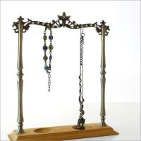 木製のトレイ付の台に 細かなピンが付いたアクセサリーのスタンド アンティークなゴールドのお洒落な色合いです 両面掛ける事が出来て ネックレスなど絡まず、ストレスがありません 下のトレイには小さなリングやピアスなどを。 プチ、デコラティブな装飾は インテリアのアクセントにもなりそうな存在感です 商品名 : ジュエリースタンド&トレイ 商品番号 : ove9120 サイズ(cm) : 幅20×奥行7×高さ23.5 ピンフックの間隔 : 0.5 材質 : 真鍮木 重量(g) : 310 生産国 : 中国 ※小さな擦り傷等はご容赦下さい。