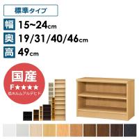 幅1cm単位でオーダーできるオーダー収納棚 安心の日本製。 低フォルムアルデヒドF品質。 外寸:幅 15〜24 × 奥行 19/31/40/46 × 高さ 49 cm 幅内寸:オーダーした幅から3.6cm引いた値 奥行内寸: 19cmタイプ/15.8cm 31cmタイプ/27.8cm 40cmタイプ/36.8cm 46cmタイプ/42.8cm 高さ内寸:36.3cm 材質:プリント紙化粧繊維板 塗装:ウレタン樹脂塗装 移動棚×1 天板耐荷重: 奥行19cm/10kg 奥行31cm/20kg 奥行40cm/20kg 奥行46cm/20kg 棚板耐荷重:10kg 生産国:日本 ホルムアルデヒド放散区分:F (フォースター) 組み立て式(30〜60分) ※組立所要時間については、目安となります。 サイズや組合せ、個々人の技量により前後いたしますのでご了承ください。 オーダー商品のため、ご注文(ご入金)後、約2週間でお届けとなります。 ご注文後のキャンセル・交換・返品・加工サイズの変更はできません。 ご確認の上、ご注文下さいますようお願い致します。