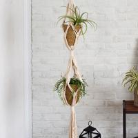 マクラメという結い技法を用いて編まれたプラントハンギングです。 プランターだけでなく、ガラスベースやカゴなどを入れて吊るしたり掛けたりと、グリーンのあるインテリアを楽しめます。 寒い時期に植物を室内へ移動させ、窓際で日光浴させるには最適なプランターハンギング。 観葉植物、エアプランツ、多肉植物などはもちろん、造花やドライフラワー,プリザーブドフラワーと組み合わせても素敵です。 南国/ハワイ/マリン/サーフ/カリフォルニアテイストのインテリアに合わせるとピッタリの小物です。 ロンハーマンやダブルティーの雰囲気がお好きな、海を感じるインテリアでコーディネートされている方にオススメです。 サイズ:約135cm 適応鉢5〜8号(プランターは付属しません) ※天然素材を使用したハンドメイド商品のため、紐の長さや編み具合も微妙に違い、素材の表情や形に個体差があります。