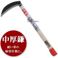 手打鋼付 厚鎌 は、刃の巾が広く草刈鎌の中でもっとも厚みがあるので、耐久性も切れ味も求めている方にお勧めの鎌です。 背丈のある硬い草刈りに向いています。 別名ナタ鎌とも言います。