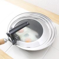 調理中も置き場に困らない、自立するフライパンカバー。 丈夫で錆びにくいステンレス製。 26cm〜30cmまで偶数のサイズのフライパン、炒め鍋に使えます。 重厚な造りで少し重みがあり、立てた時にも安定します。 カバーが沈み込まずお料理にふれない、また、フライパンの取っ手にぶつからないよう設計されています。 取っ手には菜箸を置ける溝有り。 お料理の焼き具合を確認できる窓は、衝撃に強く割れにくい強化ガラスです。 シンプルでスタイリッシュなデザインなので、出しっぱなしにしていても気になりません。