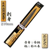 こちらの商品は「ポスト投函便」発送です。 ※配達日時の指定はできません。 柳刃(刺身)包丁 サイズ(約): 340x25x20mm 刃渡り:210mm 重量:80g 材質: 刃部:全鋼 柄:天然木 備考: 柄の部分にある「美食家」のラベルは、 シールとなっており、剥がしていただけます。 原産国: 日本製 金物のまち、三条の本格お料理包丁です! 切れ味抜群なのに激安価格! 日本古来より「庖丁刀」という言葉があります。 これは日本料理に用いる庖丁が世界的見地からも優れた、 「日本刀」の製作技術をそのまま、 受け継いで発達して来たことを意味しております。 「和風 庖丁」はこの伝統の技術で製作いたしました。 この庖丁を使うことによりお料理が一層美味しく感じられ ご家庭の健康が増すことと存じます。