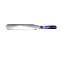 スポンジケーキにクリームを塗るときなどに使うヘラです。 スパチュラとも呼びます。 クリームを塗る他、チョコレートを薄く塗り広げる、型に流し込んだ生地の表面をならす、型の縁で擦り切りする、薄いクッキーやクレープ生地を天板から剥がすなどの作業に使用します。 刃渡り:305mm 全長:430mm |