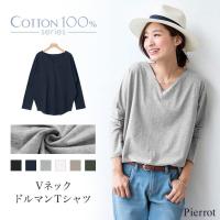 Tシャツ/コットン100/Vネック/ドルマン コットン100% Vネック ドルマンTシャツ ■素材 綿100% ■商品仕様 なし [淡色]若干あり[濃色]なし あり ■備考 色味の淡い物に、透け感が生じます。 商品には起毛加工がされているため少し毛羽たちなどが生じます。 ■商品説明 開きすぎないシャープなVネックが、顔周りをすっきりとした印象に。 さらにVネック部分は見返しデザインなので、ステッチが表に出ず上品な装いに仕上げてくれます。 丸みのある女性らしいドルマンスリーブは、袖の切り替えがないのでどこか品のある雰囲気に魅せてくれます。 バックに切り替えのラインが入り、裾が丸みのある緩やかなカッティングなのもおしゃれなポイントです! ※商品サイズは当店平置き・メジャー採寸です。 ※生産の過程上『生地を織る際の糸の継ぎ目』繊維の『混紡』、プレス加工によって形やサイズ(2〜3cm前後)に誤差が生じる場合がございますが品質上の問題はございませんのでご了承の上お買い求め下さいませ。