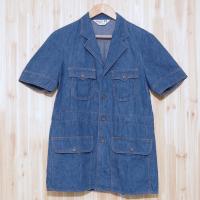 LEE SET デニム 半袖 ジャケット [JK25000067] LEE メンズM 肩幅44cm 身幅51cm 裄丈52cm 袖丈28cm 着丈78cm ブルー デニムコットン 若干の色落ちがあります。 なかなか見かけることの少ないLEE SETの半袖デニムジャケット。 内側にはドローコード(腰ひも)があり、ウエスト部分のサイズ調整が可能です。 ココナッツボタン仕様。 70年代アメリカ製 |