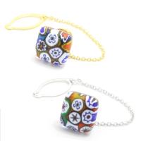 イタリアのムラーノ島の職人によって作られたガラスが美しいタイタック・ピンブローチです。 ムッリーネ(murrine)とは、単色、または多色の細長い棒状のガラスをのり巻きの要領で合わせて、断面に花や星などの模様が出るようにしたものです。 切り出した部分によって、写真と絵柄が異なりますので、予めご了承ください。 同じデザインで、カフスボタン、ネクタイピン、カフス&タイピンセット、ラペルピンもラインナップ中です。 <ムラーノ・ベネチアンガラスについて> イタリアのべネチア本島から、船で30分ほどの距離にあるムラーノ島。 世界で名だたるベネチアンガラスの本拠地で、のどかな雰囲気の街のメインストリートには、沢山のベネチアンガラスのショップが立ち並んでいます。 サイズ=10(横)×10(縦)×6(厚み)mm ブランド=ムラーノ・ベネチアン・ガラス ケース=ボックス入 |