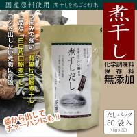 国産の原料を使用した煮干しだし。 背黒・白口片口鰯煮干しを使用。 煮干しの他に、真昆布や焼きあご、干し椎茸など国産素材を配合しています。 だしの出がよく、1〜2分煮出すだけで濃いうまみのあるだしがとれます。 化学調味料・保存料は一切使用しておりません。 袋をやぶって丸ごとお使いいただけます。