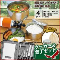 アウトドア&非常時に重宝する調理器具を一つにまとめました! これさえあれば調理して食べるまで全てOK♪ ■キャンピング鍋4点セット サイズ 鍋(大):(約)外径14.2x高さ6.6cm フライパン:(約)外径14.8x高さ3.1cm 鍋(小):(約)外径12.3x高さ6.5cm フタ兼用皿:(約)外径13x高さ1.6cm ※全て取っ手部分除く 容量 鍋(大):(約)970cc フライパン:(約)500cc 鍋(小):(約)700cc 材質 本体:ステンレス鋼(クロム13%) 携帯袋:不織布 重量 全体で約460g ■アウトドア包丁セット サイズ 万能包丁: 刃渡り195mm×1 柳刃包丁(長):刃渡り185mm×1 ペティナイフ(大):刃渡り125mm×1 柳刃包丁(短):刃渡り120mm×1 ペティナイフ(小):刃渡り195mm×1 包丁研ぎ棒:全長287mm×1 まな板:285×205×5mm×1 その他 ※輸入品になりますので、多少、箱、本体に汚れ等ある場合がございますが、ご了承下さい。 尚、よい切れ味を持続するため包丁の刃は商品到着後1回〜2回は研ぐなどしてお手入れください。