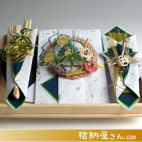 送料・代引き手数料無料食事会形式の略式結納などにぴったりな手渡しタイプの結納セットです。 白木台の上にのしと末広と結納金がのったシンプルな3点セットで、中央は松竹梅、左右に鶴亀の縁起の良い水引細工が美しいです。