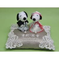リングピロー 完成品 お二人の名前、日付入れ SNOOPY スヌーピーぬいぐるみを留めてあります。 神前式に使用できるリングピローです。 グレイッシュシルバー色サテン生地にチュールレースをあしらった クッションに和装のスヌーピーペアをのせました。 |