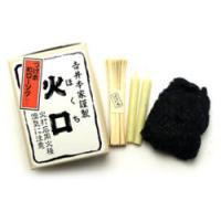 ・秘伝火口 ・付け木 ・和ローソク 誘火綿として使用する火口(ほくち)と付け木は消耗品ですので追加補充出来ます。 原料は綿・ツバナ・がまの穂を蒸し焼きにしたものに煙硝に炭や染料で赤黒色等に染めたもので火打箱に入れて火種用に使いました。 打ち出した火花がほくちに着火してジワジワと燃えて広がります。 その火に付け木をあてて炎にするのです。