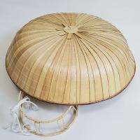 竹を薄く裂いて網代に編み上げた托鉢笠と頭台のセットです。 お椀を伏せたような形状で、托鉢僧の笠として知られています。 ※舞台用・お芝居用の物で、実用には不向きです。 市販の針金などで笠に頭台を固定してから被ってください。 托鉢笠表面にはニスを塗って防水性・耐用年数を高めました。 裏面は、薄竹をカゴメに組んだものを当て補強しました。 頭台は、竹ヒゴの土台に藤蔓や菅(すげ)、薄く裂いた竹などを巻いた味わいのあるものです。 ※自然素材や端材を利用した手作り商品ですので、仕上がりに多少のばらつきがあります。 素材や形状など若干変更となる場合があります。 ■素材 笠:本体/竹※表面ニス塗り骨組み/竹 頭台:竹ヒゴ・藤蔓・菅(すげ)など ■サイズ 笠:直径約40センチ高さ13センチ 頭台:直径18センチ高さ7センチ ■重さ 笠:150グラム 頭台:30グラム ■色 薄茶 |