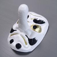 舞台稽古やお芝居用の白天狗の咥え面です。 能楽などで“早変わり”をしたり、手を使わずに装着できるよう、お面の裏側に口でくわえるための出っ張り(木の板)があります。 白天狗は、しばしば赤天狗を束ねる鬼の長(長老)として登場します。 くわえ面(白天狗)は、紙パルプ(紙粘土)を型にはめ、乾燥させてから1つ1つ顔を手描きした味わいのあるものです。 他の量販品には無い素朴な手作り感があります。 ちなみに中国伝来の天狗は、日本では、山岳信仰と結びついて霊峰とされる山々の山神とされたり、樹木に宿る精霊である木精「もくせい」・木霊「こだま」とされ崇められたり、その恐ろしい形相で病魔や災いを追い払う守護神として祀られるようになりました。 ※くわえ面(白天狗)は、手作り商品ですので、1点1点ヒゲやシワ、睫毛や眉毛などの形が違い、微妙に顔の表情が異なります。 目の部分は孔になっております。 ■素材 紙パルプ(紙粘土)※ゴム紐付 出っ張り部分:桐材 ■サイズ 巾16.5cmXタテ20cm×厚さ16cm 鼻の長さ11cm ■重さ 110グラム ■色柄 顔:白 眉毛/ヒゲ:黒 目/口:ゴールド |
