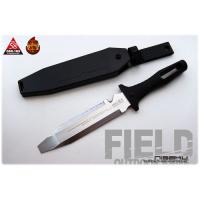 釣りや貝類の採取、水辺でのキャンプなどに幅広く使える ■チゼル型刀身 岩に張り付いた貝類などの剥ぎ取り。 コマセなどの粉砕に。 ■総焼入刀身 鉈のようにも使える頑強な3mm厚刀身。 ■ガットフック ロープや蔓などの切断。 布類の裂き切り。 ■波刃(セレーションブレード) 植物の根や枝木からロープまで軽々と切断できる。 ■刀身仕様:チゼル型刀身 ■刃部全長:110mm+90mm ■刃の厚み:3mm ■刃部仕様:波刃(セレーションブレード)ナイフ:330×61×30mm シース含:332×61×42mmナイフ:190g シース含:280gブラックシース刀身:DSR-1K6(刃部研磨仕上) グリップ:エラストマー樹脂 他:ABS樹脂、PP |