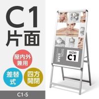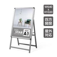 サイズ W580×H1000×D525mm(フレーム巾25mm) 素材 アルミ、ステンレス、亜鉛板、ABS樹脂、ゴム、PETフィルム(0.8mm厚) 色形 シルバー 保護シートの0.8mm厚PETフィルムは透明度が高く、耐光性・耐久性に優れています。 裏板は亜鉛板なので錆に強く屋外でも安心して使えます。 フレームは指1本で簡単に開きます。 ※屋外使用の場合はポスターに防水加工を施してください。 スタンド看板。 ポスターフレーム。 片面。