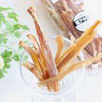 南米馬アキレスをただ乾かしただけ、 完全無添加、こだわりのオヤツです。 添加物もなく、徹底的に乾燥させています。 かみ応えがあるので、長く楽しめるワンちゃん用オヤツです。 そのなかでも、長めのタイプが多く含まれます。 小型犬に上げる場合や、のどに詰まらせたりする場合には はさみなどで切って与えて下さい。