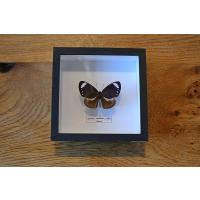 軟化作業から展翅、装飾、標本箱制作、全て1から制作したSiboraオリジナルの蝶標本です。 南アメリカ熱帯域で観測される蝶です。 両後翅には2つの眼状紋があり、透けている翅はとても美しく光に当てると後ろに翅の影が映りそれもまた美しい姿として楽しめます。 お部屋やお店のオブジェにいかがでしょうか〜 |