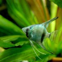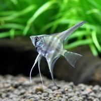 エンゼルフィッシュは南アメリカ・アマゾン川水系原産の淡水魚であり、 観賞用熱帯魚の代名詞の一つともいえる種です。 マーブルエンゼルはエンゼルフィッシュの改良品種で、 縞模様の代わりに大理石のような黒い模様が入るのが特徴です。 エンゼルフィッシュは体高が高く、ゆったりと泳ぐ姿が非常に美しいです。 飼育は水質、水温など適応範囲が広く容易です。 最大全長:15cm 温度:23〜28度 |