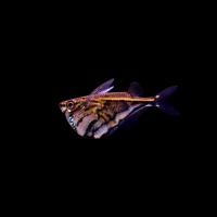 学名:Thoracocharax stellatus 分布:アマゾン川、オリノコ川 全長:約10cm メタリックシルバーの体色と、前方に大きく突き出た体形が魅力的な種。 一度水槽内で落ち着いてしまうと非常に丈夫で浮上性であれば人工飼料もよく食べます。 水質も弱酸性から中性で問題なく混泳も可能です。 ハチェット類はちょっとした隙間から飛び出してしまうことがあるので特に注意が必要です。