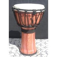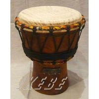 インドネシア製マホガニージャンベのナチュラルモデルです。 通常のモデルより打面が大きく作られています。 ヘッドには中厚の上質ヤギ皮が使用され、ロープもしっかりとしたものが張られています。 小さなサイズですので本格的な演奏には向きませんが、強いテンションにも耐えられる構造ですので、カンカンに張るととても良い音がします。 (ヘッドの色合いは1点ずつ異なります。 ) ※発送前にチューニングをしてお届けします。 胴体:マホガニー、ヘッド:ヤギ皮(中厚) サイズ-高さ:約40cm、打面内径:約22cm、外径:約25cm、ボトム径:約17cm、重量:約3kg |