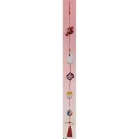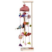 傘付鞠付4連に鳩・金魚・猿っ子など12種類の縁起物を吊るしたミニタイプ卓上型です。 ※スタンドが、茶色に変更する場合がございます。 スタンド高47cm |