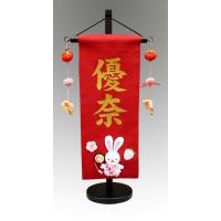 女の子用名前旗いちごうさぎ(小) 縮緬細工のうさぎが付いたとても可愛い小サイズの名前旗です。 ミニサイズの親王飾りや木目込み雛等、高さが低いお雛様に合う名前旗です。 人気の赤色縮緬生地にうさぎの縮緬細工が施され、両サイドに可愛いいちごのさげ物が付いています。 お子様のお名前は、金色文字プリント仕上げで入ります。 飾り台の全長38.5cm旗の幅12cm ※価格は、名前入れ代金込みのご奉仕価格です。 ※名前入れには、10日程かかります。 ※ご注文の際は、通信欄にお子様のお名前をお書き下さい。