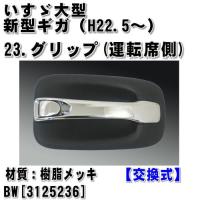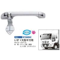 品番 572252 フロントグリップ いすゞ 大型ギガ用 純正グリップを取り外して交換してください。 取付ボルトやパッキン等は、純正品を流用してください。 グリップ部:樹脂 ヒンジ部:ダイキャスト ※ 本製品はアクセサリーであり、純正部品ほどの強度はありませんので無理な荷重や衝撃をあたえないようご注意ください。 ※ 車種、年式によっては取付できない場合があります。 ※ 純正グリップを取り外して交換してください。 取付ボルトやパッキン等は純正品を流用してください。