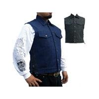 デニムベスト ・素材:デニム生地・牛革・牛革紐 ・カラー:インディゴ・ブラック ・サイズ:36〜48インチ ・備考:左右のサイドレースで調節可能 オールドスクールなバイカーベストと言えばこれ! デニムベストのサイドを革で補強し、サイドレースを拡げる事で革のジャケットの上からでもサイズアップして着る事が出来ます。 デニム生地でチームカラーやパッチ等も貼り付け易く、チームでの購入にも手頃な価格のアイテムです....... |