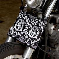 イージーライダース JAM'S ゴールドスプラッシュガード カラー:アイボリー 表:コットン 裏:ネオプレーン バンダナ柄のフロントマッドガードです。 バックル着脱で簡単取付できます。 急な雨でも安心&まるでバンダナを巻いているかのようなデザイン。 人とちょっと差をつけたい方にオススメです。 ※汎用品のため、現車確認をお願いします。 送料は、佐川急便 5kg以下(関東の場合600円)です。