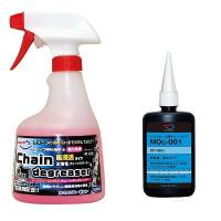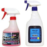 <バイク用チェーンディグリーザー500ml> バイク特有の油汚れを強力洗浄。 チェーンの奥の汚れまで、浸透して落とします。 高浸透タイプの水溶性チェーンクリーナー。 チェーンのサビを防ぐ、防錆剤入りです。 また、植物系洗剤のため、環境にもやさしい。 シールチェーンにも使用可能です。 Oリングを侵しません。 <バイク用バイクウォッシュ950ml> 車体の隅々までピカピカに仕上げる水溶性クリーナーです。 吹きつけて拭くだけで、ホコリ・油汚れを強力洗浄。 これ1本で、バイクを丸ごと洗えます。 また、特殊シリコン被膜により、表面を保護し、汚れの再付着を防止します。 つや出し、防水にも効果あり。 バイクの素材各種に対して、安全な車体洗浄剤です。
