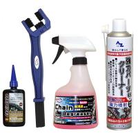 <バイクレース用チェーンルブ EP 110ml> WETタイプ 極圧剤を贅沢に配合!! レースに最適なチェーンオイル。 ここ一番の勝負用に!! 極圧添加剤の特性をとことん追求し、メカニカルノイズを低減しました。 高速・高荷重に耐える、バイクチェーン用潤滑剤です。 シールチェーン対応。 <バイク用チェーンディグリーザー500ml> バイク特有の油汚れを強力洗浄。 チェーンの奥の汚れまで、浸透して落とします。 高浸透タイプの水溶性チェーンクリーナー。 チェーンのサビを防ぐ、防錆剤入りです。 また、植物系洗剤のため、環境にもやさしい。 シールチェーンにも使用可能です。 Oリングを侵しません。 <三面ブラシ> バイクチェーンのお掃除に最適。 ブラシが3面からチェーンを囲い込んで、簡単、素早くきれいにします。 より細かな汚れ落しに便利なロングブラシが片方についています。 ナイロンブラシでシール入りチェーンにも安心してお使いいただけます。 *注意:清掃の際は必ずエンジンを切った状態で行ってください。