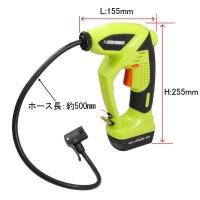 ■商品仕様: ・本体サイズ:L155×W65×H255mm (※バッテリー含む/ホース含まず ) ・ホース長:約500mm (クリップチャック含む) ・重量 1Kg ・バッテリー:リチウムイオン ・容量:1,300mAh ・電圧:DC12V ・充電器電圧:DC13V ・充電器電流:1.5A ・充電時間:約1時間 ・最大連続使用時間:約10分 ・無負荷回転数:18000rpm ・最大空気量:14L/min ・最大空気圧力:800KPa ・ゲージ使用可能範囲:0〜800KPa 《付属品》 ・付属品 充電器×1 ・バッテリー×1 ・ニードルアダプター×1 ・浮き輪用アダプター×1 ・専用ケースサイズ:L295×W280×H100mm ■商品説明: 米式、仏式バルブの自転車や浮き輪などに充填できます。 ■注意事項: ※本製品は自転車専用となります。 車やバイクのタイヤ、多量の空気を必要とする用途には、使用しないでください。 ※連続運転時間は、最大10分です。 10分使用した後は、必ず10分以上冷まし、手で触れても暖かくないことを確認してください。 ※必ず、測定範囲内で使用してください。