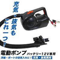 12V電動エアーポンプ 空気の充填はもちろん、排気が早く出来てとても便利。 乗用車用12V電動エアーポンプ 本体高さ長さ約25cm、幅約13cm、高さ約17cm コード全長約2.8m 重量約1.4kg ゴムボート、浮き輪、エアマットなどに空気を充填します。 アタッチメントを「INFLATE」に差し込むと、吸気。 アタッチメントを「DEFLATE」に差し込むと、排気します。 アタッチメントは、サイズに応じて三種類。 一番小さなアタッチメントで、普通の浮き輪などが充気できます。 大きなアタッチメントに交換することで、エアマットや、大きなゴムボートにも使用できます。 小さなアタッチメントには、目を離している間の吸気によるバースト(パンク)を防ぐため、小さな穴が開いています。 指で穴を押さえながら充気して下さい。 排気の際も、アタッチメントの穴を押さえながら作業すると、とても速く、簡単にできます。 浮き輪やボートなどを使用する場合は、最後にもう一度空気の量やバルブの栓がしっかりと閉まっているかを確認しましょう。