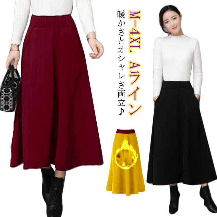 暖かさとオシャレさ両立♪毛布のような裏起毛生地で寒い冬でもおしゃれでぽかぽかあったかなフレアスカート。下半身をすっぽり包み込みロング丈、まさに秋冬の本命スカート。両サイドにはポケット付きでとても便利。 サイズM L XL 2XL 3XL 4XLサイズについての説明M 裾周り210 ウェスト60 着丈80 L 裾周り215 ウェスト65 着丈80 XL 裾周り220 ウェスト70 着丈80 2XL 裾周り225 ウェスト75 着丈80 3XL 裾周り230 ウェスト80 着丈80 4XL 裾周り235 ウェスト85 着丈80素材ポリエステル色ブラック裏起毛 ワインレッド裏起毛備考 ●サイズ詳細等の測り方はスタッフ間で統一、徹底はしておりますが、実寸は商品によって若干の誤差(1cm〜3cm )がある場合がございますので、予めご了承ください。 ●商品の色は、撮影時の光や、お客様のモニターの色具合などにより、実際の商品と異なる場合がございます。あらかじめ、ご了承ください。●製品によっては、生地の特性上、洗濯時に縮む場合がございますので洗濯時はご注意下さいませ。▼色味の強い製品によっては他の衣類などに色移りする場合もございますので、速やかに(脱水、乾燥等)するようにお願いいたします。 ▼生地によっては摩擦や汗、雨などで濡れた時は、他の製品に移染する恐れがございますので、着用の際はご注意下さい。▼生地の特性上、やや匂いが強く感じられるものもございます。数日のご使用や陰干しなどで気になる匂いはほとんど感じられなくなります。