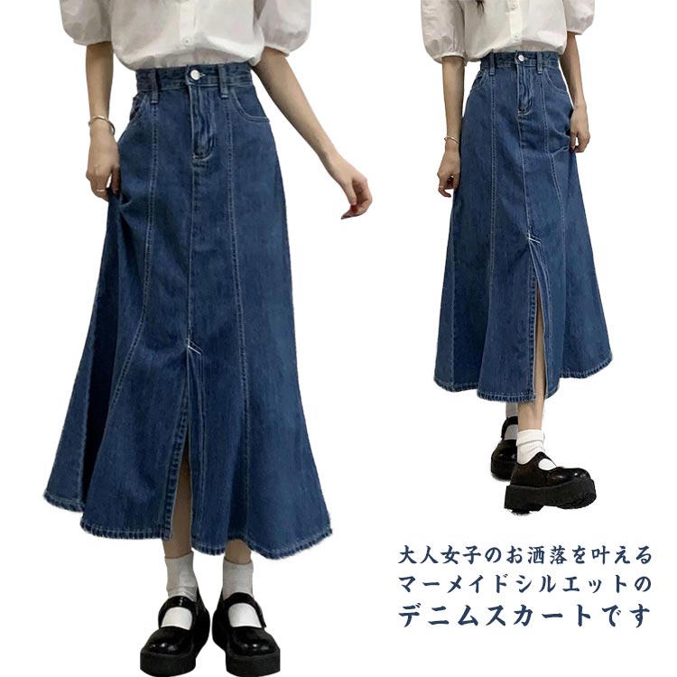 大人女子のお洒落を叶えるマーメイドシルエットのデニムスカートです。腰周りはスッキリ裾はフレアに広がりタイルアップ効果が期待できます。フロントには足さばきも良くなるセンタースリットを施しました。ウォッシュ加工を施すことでヴィンテージライクなこなれ感ある雰囲気に。すっきりと縦長が協調されるミモレ丈なのでトップスインでもきれいに決まります。 サイズS M L XL 2XL 3XL 4XL 5XLサイズについての説明S:スカート丈83cm ウェスト64cm ヒップ88cm 裾回り130cm/ M:スカート丈84cm ウェスト68cm ヒップ92cm 裾回り134cm/ L:スカート丈85cm ウェスト72cm ヒップ96cm 裾回り138cm/ XL:スカート丈86cm ウェスト76cm ヒップ100cm 裾回り142cm/ 2XL:スカート丈87cm ウェスト80cm ヒップ104cm 裾回り146cm/ 3XL:スカート丈88cm ウェスト84cm ヒップ108cm 裾回り150cm/ 4XL:スカート丈89cm ウェスト88cm ヒップ112cm 裾回り154cm/ 5XL:スカート丈90cm ウェスト92cm ヒップ116cm 裾回り158cm/ ※サイズ表の実寸法は商品によって1-3cm程度の誤差がある場合がございます。素材ポリエステル色デニムスカート備考 ●サイズ詳細等の測り方はスタッフ間で統一、徹底はしておりますが、実寸は商品によって若干の誤差(1cm〜3cm )がある場合がございますので、予めご了承ください。 ●商品の色は、撮影時の光や、お客様のモニターの色具合などにより、実際の商品と異なる場合がございます。あらかじめ、ご了承ください。●製品によっては、生地の特性上、洗濯時に縮む場合がございますので洗濯時はご注意下さいませ。▼色味の強い製品によっては他の衣類などに色移りする場合もございますので、速やかに(脱水、乾燥等)するようにお願いいたします。 ▼生地によっては摩擦や汗、雨などで濡れた時は、他の製品に移染する恐れがございますので、着用の際はご注意下さい。▼生地の特性上、やや匂いが強く感じられるものもございます。数日のご使用や陰干しなどで気になる匂いはほとんど感じられなくなります。