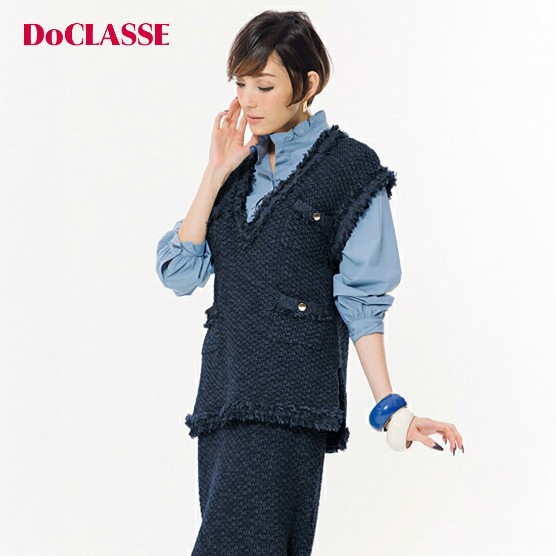 素材ポリエステル51%・綿49%洗濯表示手洗い可サイズ詳細サイズ着丈バストS6596M66100L67104XL68108・色:グリーン / ネイビー・注意事項:モニターの発色具合により色合いが異なる場合がございます。 【関連キーワード】 DoCLASSE ドゥクラッセ 大人の服 30代 40代 50代 レディース メンズ きれいめ 大人カジュアル オフィスカジュアル 通勤 旅行 体型カバー 着痩せ ストレッチ 洗える 防シワ 速乾 接触冷感 UVカット 撥水 保温 裏起毛 軽量 セットアップ ワンピース シャツ ブラウス Tシャツ カットソー ニット セーター カーディガン パンツ スカート コート ダウン ブルゾン ジャケット ベスト バッグ ゴルフ マジカルサーモ Doヒート メーカー希望小売価格はメーカーサイトに基づいて掲載していますツイーディニット・Vネックベスト注目のツイード調素材を今っぽく。ゆるっとラフに着ても上品さが残る、ニット素材の華やかベストグリーンネイビートレンドのツイード調素材は、かっちりしすぎずラフに着るのが今っぽく仕上げるコツ。その点、ゆったりベストなら遊び心がしっかり伝わります。太さの異なる糸で凹凸感を出し、タック編みでツイード調にしたニット素材。フリンジもたっぷり飾った華やかなデザイン。