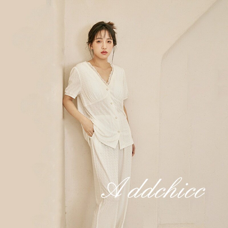 ▲商品内容:パジャマ(トップス+パンツ) ▲素材:ポリエステル ▲サイズ: ・トップス: 【S】:身丈 49cm、バスト 111cm、袖丈 24.5cm 【M】:身丈 50cm、バスト 115cm、袖丈 25cm 【L】:身丈 51cm、バスト 119cm、袖丈 25.5cm 【XL】:身丈 52cm、バスト 123cm、袖丈 26cm ・パンツ: 【S】:身丈 32cm、ウエスト 62cm、ヒップ 102cm 【M】:身丈 33cm、ウエスト 65cm、ヒップ 106cm 【L】:身丈 34cm、ウエスト 68cm、ヒップ 110cm 【XL】:身丈 35cm、ウエスト 71cm、ヒップ 114cm ▲注意事項: ・測定したサイズは素人採寸のため1〜3cm程度の誤差が生じる場合があります。 ・商品画像はライトの下で撮影しており、ご覧いただくモニター等の違いで画像と実商品の色合いが若干異なる場合がございますので、予めご了承下さい。 ▲お手入れについて: ・ご着用いただく前に、一度洗濯してください。 ・水または30度以下のぬるま湯で手洗いしてください。 ・柔軟剤・塩素系漂白剤の仕様はお避け、中性洗剤をご使用ください。 ・手で軽く絞りの後、風通しの良い場所で形を整えて陰干ししてください。 (脱水機、乾燥機のご使用はお避けください。) ・素材の特性上、洗濯の際に若干の伸び縮みが起こる可能性があります。 シルク パジャマ レディース 半袖 可愛い 大きいサイズ 春夏 薄手 無地 上下セット パンツ Vネック レース ナイトウェア エレガント 高級 フェミニン 部屋着 寝間着 寝巻き 婦人 女性用 彼女 妻 旅行 入院 快適 プレゼント お祝い 人気 ルームウェア セットアップ