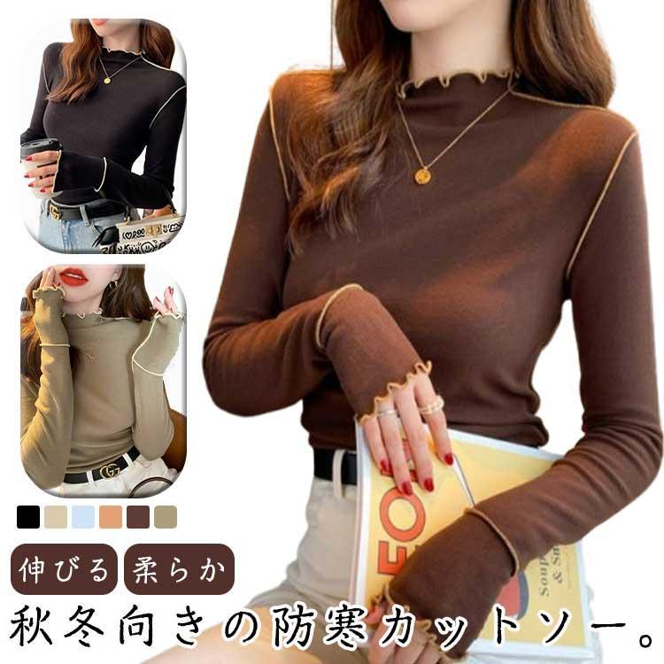 秋冬インナーカットソートップスプチハイネックフリルカットソーレディース防寒インナーフリル長袖ハイネックtシャツストレッチ保温