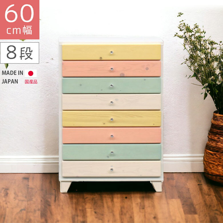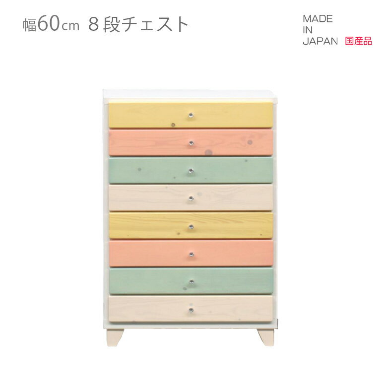 木製ミドルチェスト幅60cm8段パイン材使用日本製リビングチェスト脚付きチェスト丈夫な箱組仕様引き出し木製ミドルチェストリビングボード収納家具キャビネット衣類収納取手付きパステルカラーブルーイエローピンクホワイト